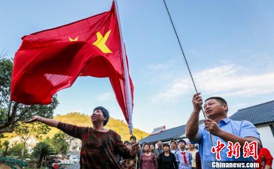 中新网湖州10月2日电(记者 胡小丽 通讯员 徐超超)国庆节当日早晨6时,伴随着手机里播放的国歌,一面鲜艳的五星红旗在浙江省德清县武康街道对河口村一个农家小院里冉冉升起。国庆节举行升国旗仪式是55岁的女主人朱来娣坚持了20年的习惯,与往年相比,这次来参加升旗仪式的,除了朱来娣的家人,还有村里50多位村民。
