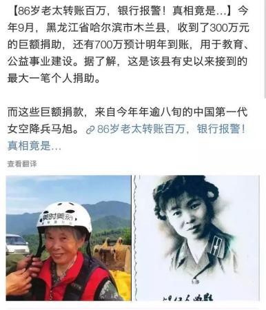 而这些巨额捐款,来自今年年逾八旬的中国第一代女空降兵马旭。
