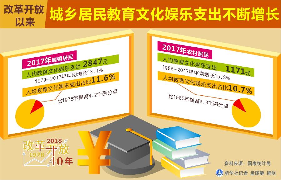 图表:改革开放以来城乡居民教育文化娱乐支出不断增长 新华社记者 孟丽静 编制