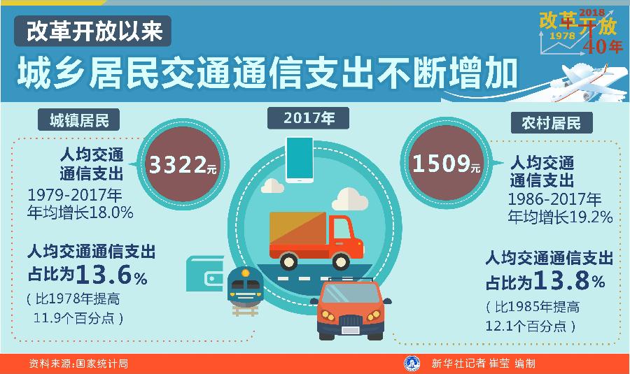 图表:改革开放以来城乡居民交通通信支出不断增加 新华社记者 崔莹 编制