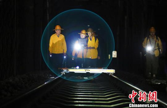 中新网曲靖9月4日电 (杨永全 张伟明) “今天检查的项目是胜境关隧道及其它线路,大家睁大眼睛检查仔细点。”4日,在南(宁)昆(明)铁路盘西线,中国铁路昆明局曲靖工务段富源线路检查工区工长刘全一边提醒工友们,一边把轨检仪安放置钢轨上。