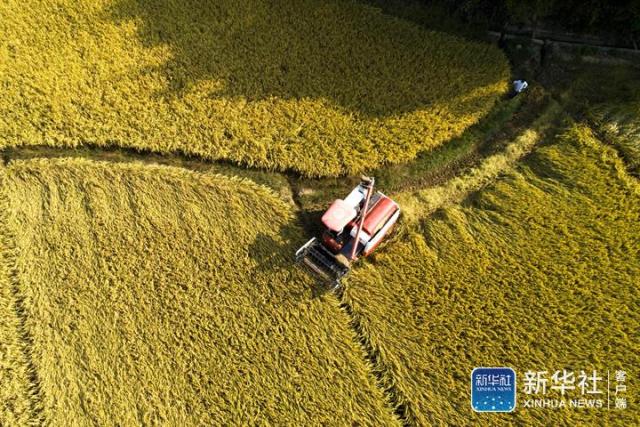 ↑10月4日,在江西省都昌县多宝乡洛阳村,农民驾驶农机收割水稻(无人机拍摄)。新华社发(傅建斌 摄)