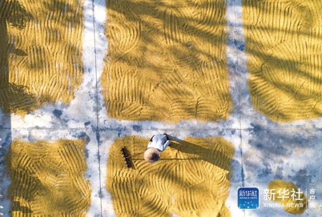 ↑10月4日,江西省都昌县多宝乡洛阳村的农民在晾晒稻谷。新华社发(傅建斌 摄)