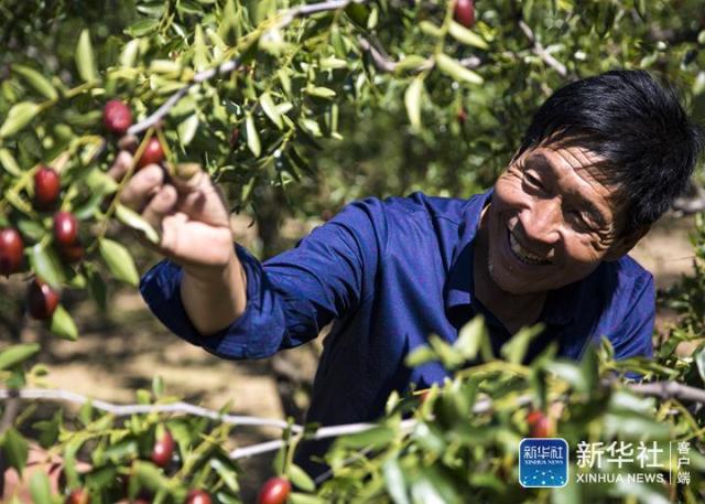 ↑10月3日,山西省临汾市襄汾县官滩村农民在收获红枣。新华社发(王稳锁 摄)