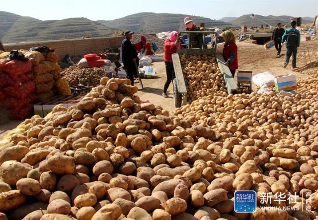↑10月4日,在甘肃省会宁县大沟镇,农民在整理收获的马铃薯。新华社发(常琦彪 摄)