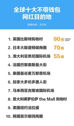 中国人出境游消费升级也带动了全球的消费数据增长,由此衍生出了新一批网红目的地。支付宝发布的数据显示,这个十一黄金周,在首批40个出境游不带钱包地标中,英国比斯特购物村以移动支付增长90倍的速度领跑所有热门目的地。