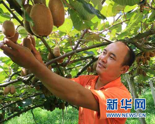 8月29日,果农在修文县谷堡镇猕猴桃基地里查看猕猴桃的成熟度。(8月28日,新华网 卢志佳/摄)