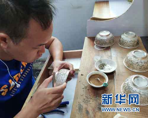 丹寨国春银饰的技术工人正在给银碗贴丝(8月28日,新华网 黄勇/摄)