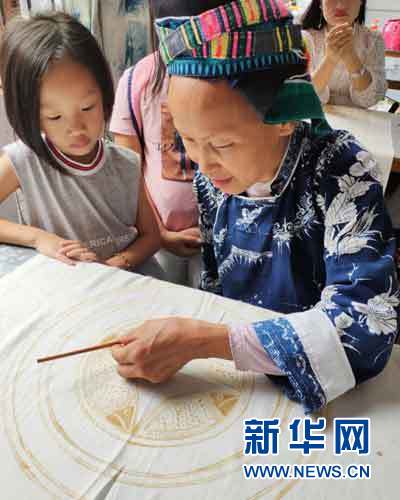 丹寨县民间艺人杨而郎在进行蜡染作画(8月28日,新华网 黄勇/摄)
