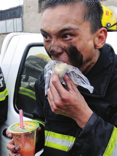 经历了一夜的救援之后匆忙吃早餐。