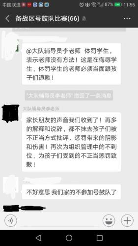 事发后,有家长表示,老师这样侮辱学生,他的孩子将不再参加号鼓队比赛。随后,当事的外聘人员王老师被拉入“备战区号鼓队比赛”微信群,并向家长们诚挚道歉。很快有家长表示,他选择原谅,只是希望老师“学高为师,身正为范”。