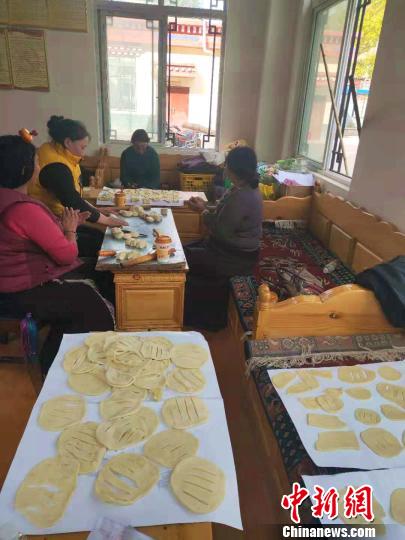 图为江达县江达镇建档立卡贫困民众自发组织为灾区做烤饼。江达县宣传部供图