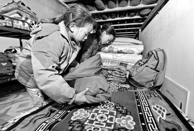 ⬆13日,西藏昌都市江达县波罗乡第一小学的师生安全转移,在同普乡中心小学临时宿舍内,孩子们在整理床铺。新华社发