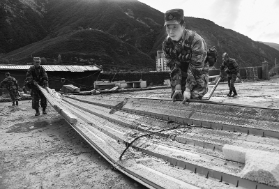 ⬆13日,西藏昌都军分区前方救灾官兵在波罗乡一工地忙碌。新华社发
