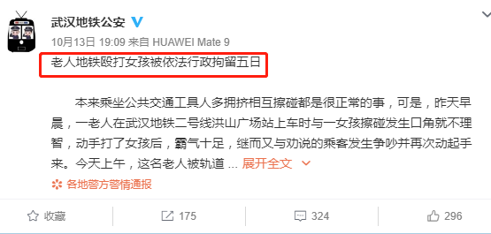 据武汉地铁公安微博,10月12日早上7点多,一名60多岁的老人在地铁2号线洪山广场站乘坐地铁,在列车车门即将关闭时,老人迅速上车撞到了前面的女孩,女孩被撞后倒在前面女乘客身上,女孩对老人说:“你不能这样推人啊。”