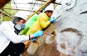 完成填充后,技术人员还将对恐龙足迹进行防水处理。曾光格介绍,技术人员将防水剂涂在足迹表面,使其能够抵挡住雨水的侵蚀。