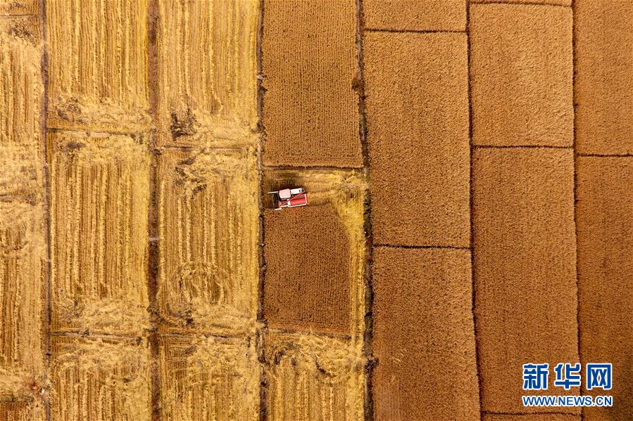 在太原市晋源区赤桥村,收割机在稻田里作业(10月17日无人机拍摄)。近日,山西省太原市晋源区2000多亩水稻迎来收割季。 金秋时节,农民们忙着收获成熟的农作物,喜迎丰收。 新华社记者 詹彦 摄