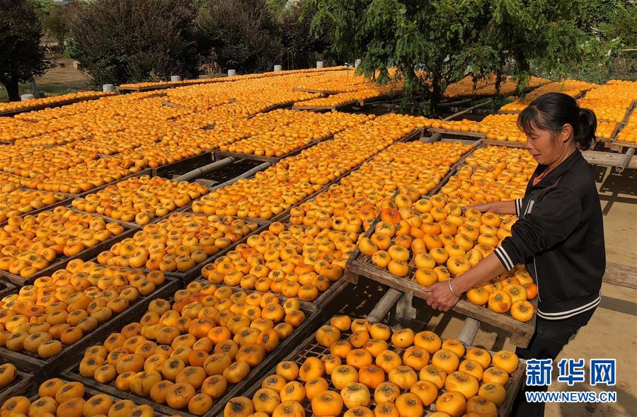 10月17日,广西桂林市平乐县沙子镇渡河村农民在晾晒柿子(手机拍摄)。 金秋时节,农民们忙着收获成熟的农作物,喜迎丰收。 新华社记者 黄孝邦 摄