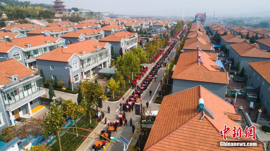 10月17日,农历九月初九重阳节,“中国幸福村”山西省长治市长治县振兴村百名小学生为当地60岁以上的老人洗脚敬孝。当日,该村及周边数百名老人还一同登高健身,共享长街宴,品尝当地特色美食振兴十大碗。孙兵兵 摄