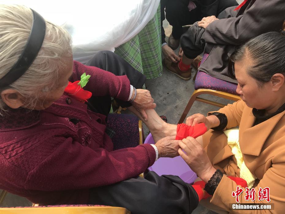 洗完脚后,晚辈为老人穿上崭新的红袜子,意祝老人健康长寿。韩章云 摄