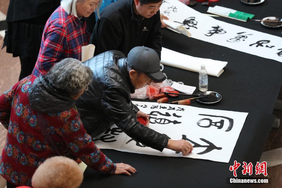 10月17日,数十位老年书法爱好者齐聚黑龙江省图书馆,以挥毫泼墨的形式庆祝重阳佳节。图为活动现场。中新社记者 于琨 摄