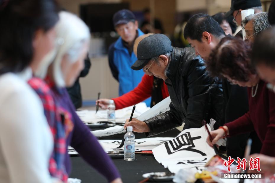 10月17日,数十位老年书法爱好者齐聚黑龙江省图书馆,以挥毫泼墨的形式庆祝重阳佳节。图为活动现场。中新社记者 于琨 摄