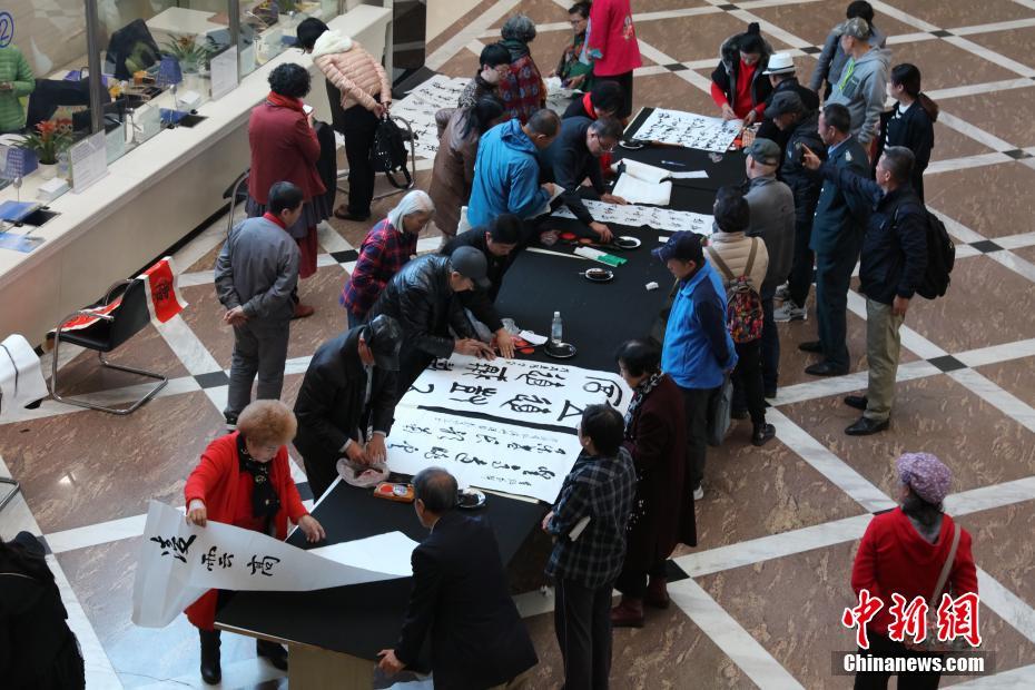 10月17日,数十位老年书法爱好者齐聚黑龙江省图书馆,以挥毫泼墨的形式庆祝重阳佳节。图为活动现场。中新社记者 于琨 摄