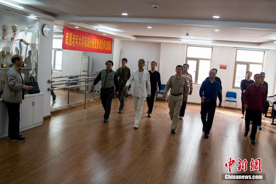 10月17日,武汉市武昌区南湖街老年大学二楼训练场,“南湖帅哥”老年男模队的队员在这里集体训练。高挑挺拔的身材,身着时尚新潮的服装,踏着节奏走起台步,再顺势摆出一个姿势亮相。“南湖帅哥”老年男模队是2012年组建的,已经发展为两个班,一个基础班一个提高班,每个班20人。这支老年男模队成员都是六十岁以上的老人。中新社记者 张畅 摄