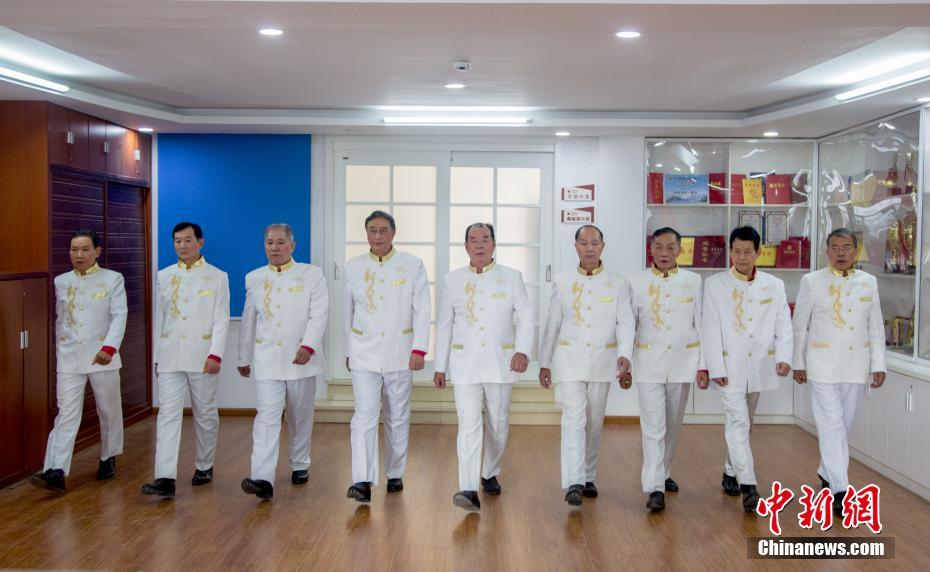 10月17日,武汉市武昌区南湖街老年大学二楼训练场,“南湖帅哥”老年男模队的队员在这里集体训练。高挑挺拔的身材,身着时尚新潮的服装,踏着节奏走起台步,再顺势摆出一个姿势亮相。“南湖帅哥”老年男模队是2012年组建的,已经发展为两个班,一个基础班一个提高班,每个班20人。这支老年男模队成员都是六十岁以上的老人。中新社记者 张畅 摄