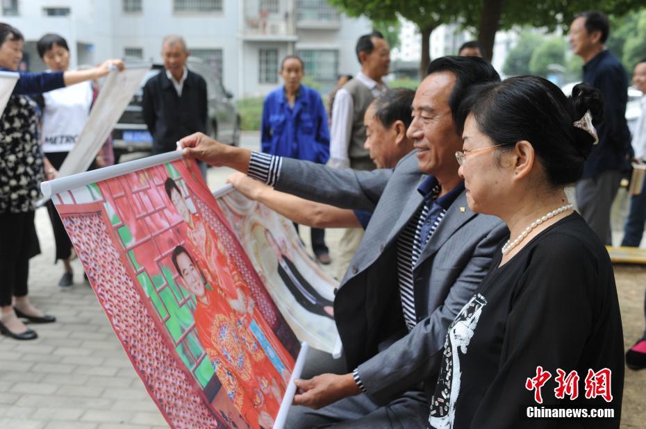 10月17日,一对夫妻在欣赏补拍的婚纱照。当日是中国传统节日重阳节,安徽合肥滨湖明珠社区邀请专业的摄影机构为辖区50对50岁以上的中老年夫妇免费拍摄婚纱照。中新社记者 张娅子 摄