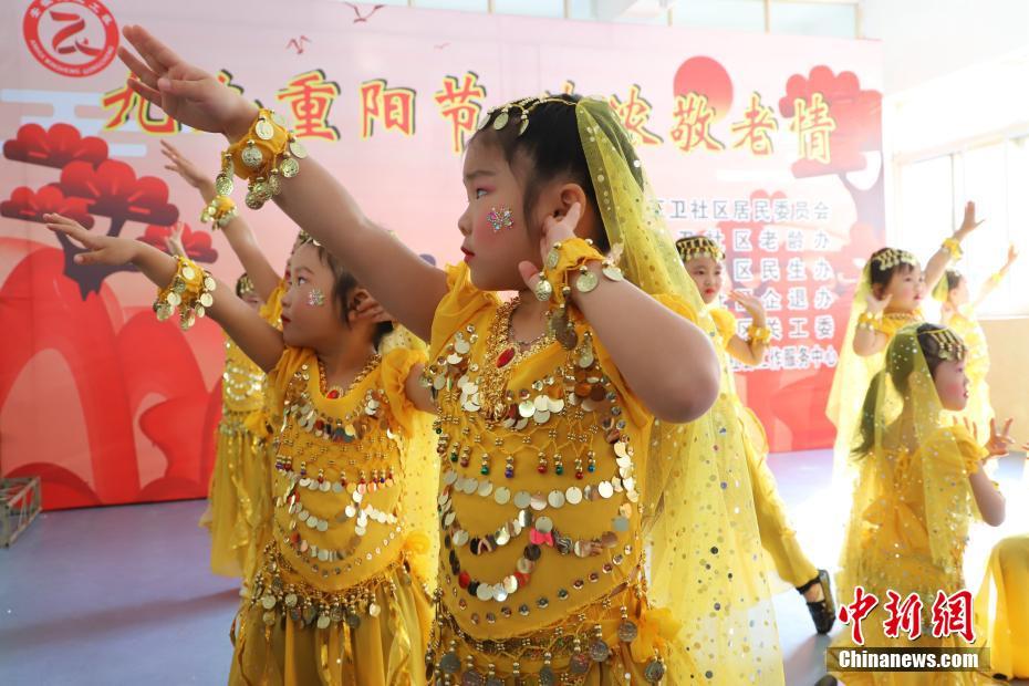 10月17日,小朋友为老人表演舞蹈,陪伴老人温暖过节。当日,安徽省合肥市王卫社区举行“九九重阳节 浓浓祖孙情”活动,组织小朋友们开展孝老敬老、歌舞表演等活动,庆祝重阳节的到来。中新社发 陈虹 摄