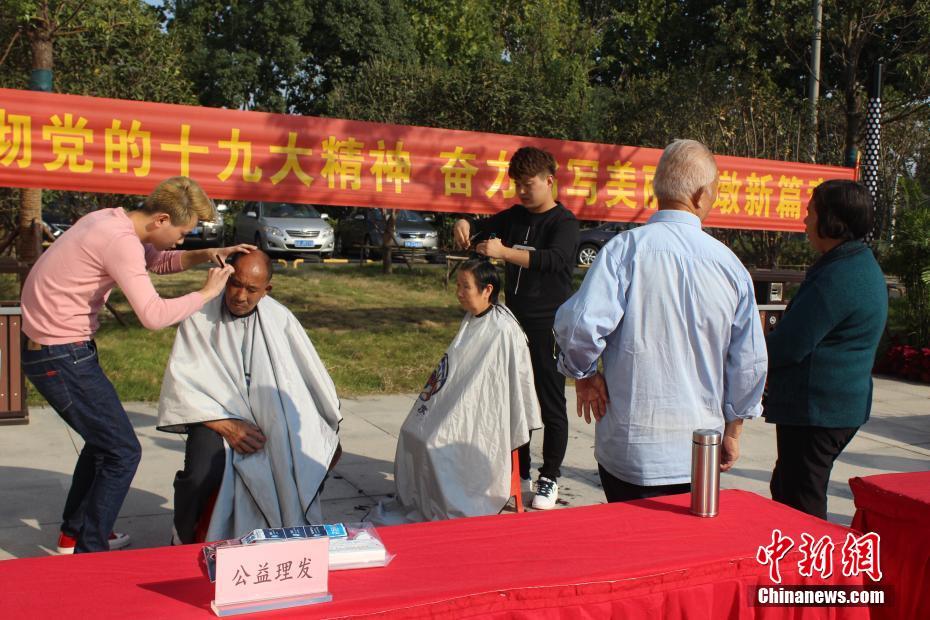 10月17日,社区志愿者在为老年人免费理发。当日是中国传统节日重阳节,安徽合肥市包河区烟墩街道启动2018年“敬老月”活动,营造敬老爱老的社会氛围。中新社发 钟欣 摄