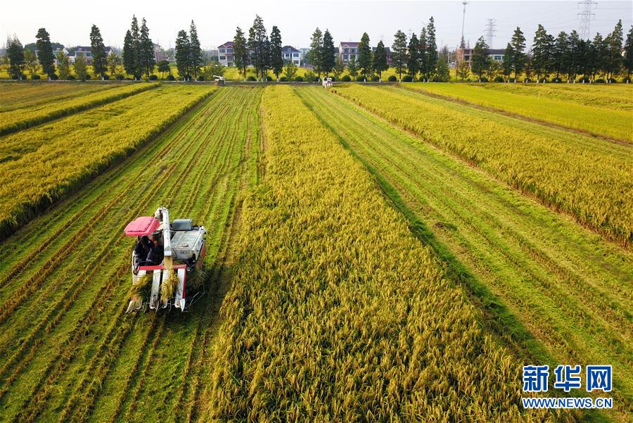 10月17日,收割机在太仓市双凤镇收获早稻(无人机拍摄)。 当日,江苏省太仓市双凤镇的早稻开镰收割。该市大面积水稻收割工作预计月底全面铺开。 新华社发(计海新 摄)