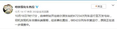 中新网10月18日电 今日,有报道称停靠在哈尔滨万发屯站的一列车车厢内冒出大量浓烟。下午,哈尔滨铁路局绥化车务段官方微博针对此事回应称,10月18日7时17分,由神树站开往哈尔滨东站的K7234次列车运行至万发屯站,司机发现机车非操纵端冒烟,经妥善处置后,8时42分列车恢复运行,原因正在进一步调查中。