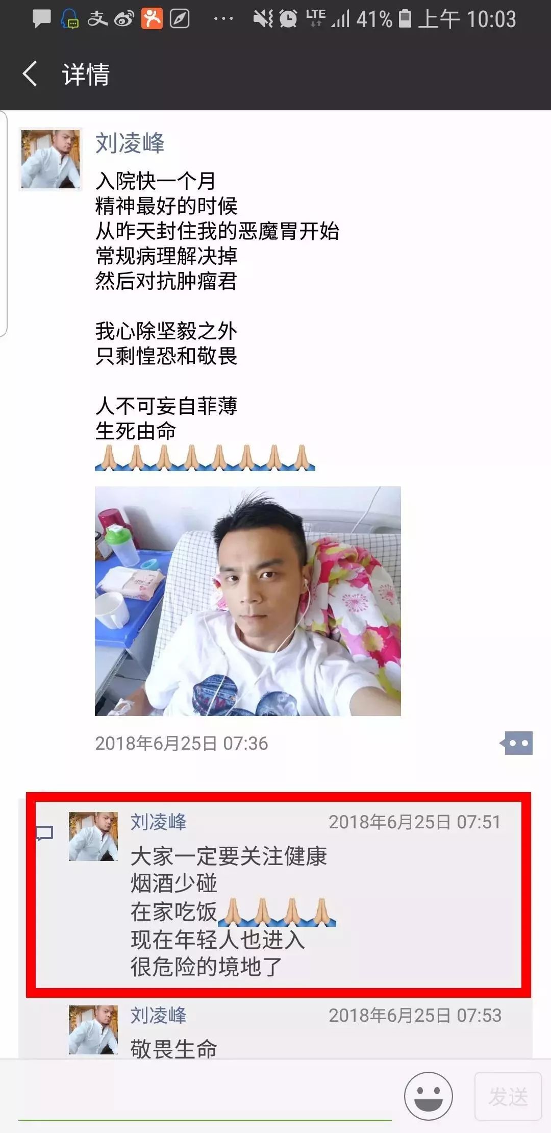 他在朋友圈写下自己的劝诫,“大家一定要关注健康,烟酒不碰,在家吃饭。”