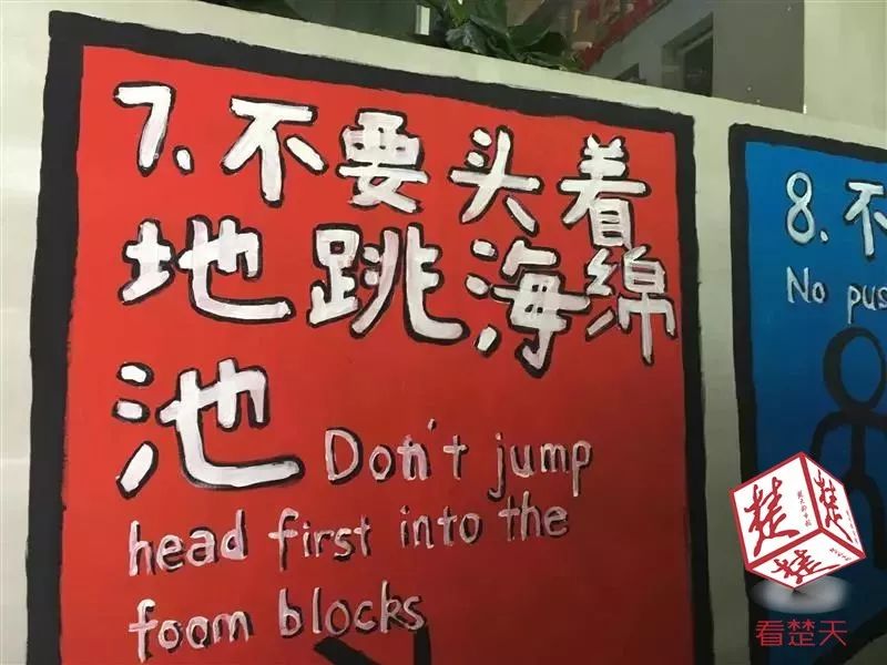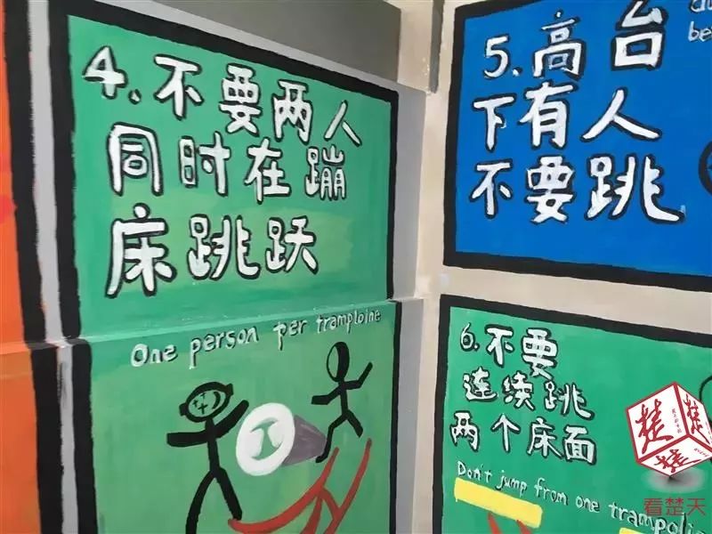 游玩区内的蹦床区旁边就是海绵池,由于场馆早上刚开门,还没顾客光临,两名工作人员在游玩区休息。