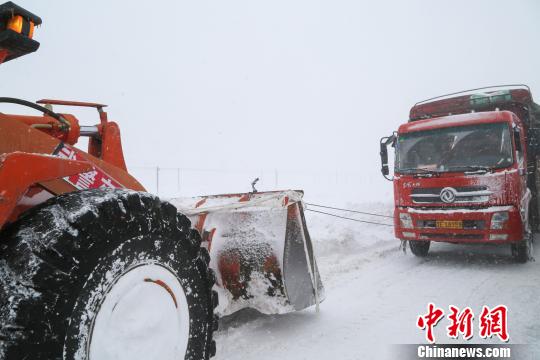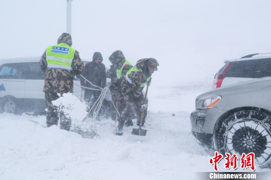 图为武警某部交通三支队养护十七中队官兵救助被大雪围困的车辆。武警某部交通三支队 供图