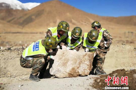 图为武警某部交通三支队养护十七中队官兵清理巨石。武警某部交通三支队 供图