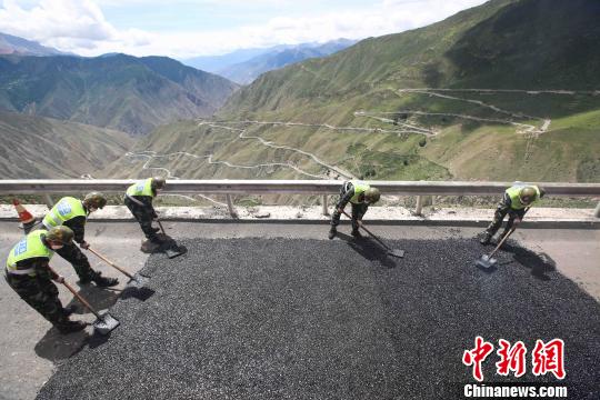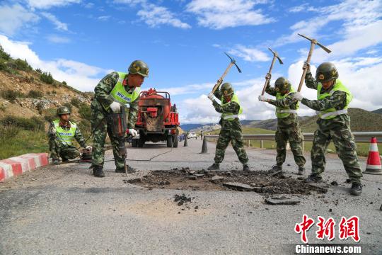 图为武警某部交通三支队养护十七中队官兵平整修补路面。武警某部交通三支队 供图