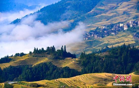 资料图:金秋十月,广西桂林市龙胜各族自治县龙脊梯田稻谷成熟,吸引了大批中外游客前来观光游览。 潘志祥 摄