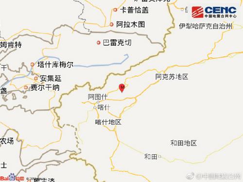 中新网11月4日电 据中国地震台网消息,中国地震台网正式测定:11月04日05时36分在新疆克孜勒苏州阿图什市(北纬40.24度,东经77.63度)发生5.1级地震,震源深度22千米。