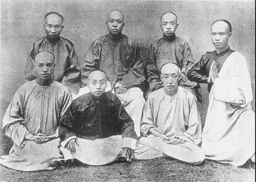 1896年9月25日,谭嗣同(右一)与梁启超(左一)等“七贤”在位于上海外滩附近的“光绘楼”照相馆合影。来源:受访者供图