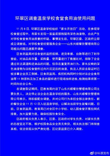 中新网11月11日电 近日,有网友反应,威海环翠区温泉学校存在食用油安全问题。今日,针对此事,山东省威海市环翠区人民政府新闻办公室官方微博发布最新调查结果通报。通报称,经调查,家长反映的深色油渣物为该校食堂炸过肉片沉淀后的油渣,该校食堂存在使用重复油行为。