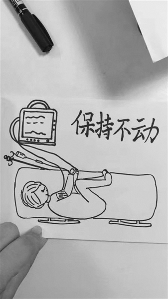 林文秀是泗阳县人民医院手术室的一位麻醉医生。11月12日上午,手术室第一台手术的患者是一位聋哑人,要做的是右足滑囊炎手术,林文秀赶紧到手术室里做前期的麻醉准备。“做一些下肢手术,需要打一个椎管类麻醉,让患者做手术的时候下半身不疼,这个时候要保持一个体位,摆这个体位的时候要求比较严格,才能让打这个麻醉的时候顺利进行,要告诉他,两个腿要抱在胸口,手抱住膝盖,他万一害怕蜷缩,这个打针就没有办法进行。”林文秀就通过画漫画告诉他,这个不会疼,坚持一下就好了。