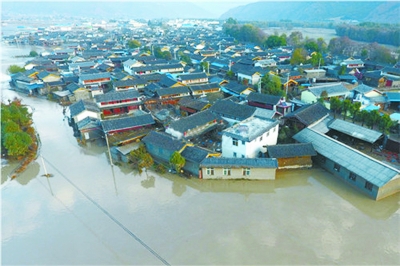 图为丽江石鼓镇受灾航拍。 图片来源:云南日报