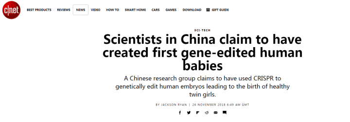 (美国CNET网站:中国科学家声称已创造出首例基因编辑婴儿)