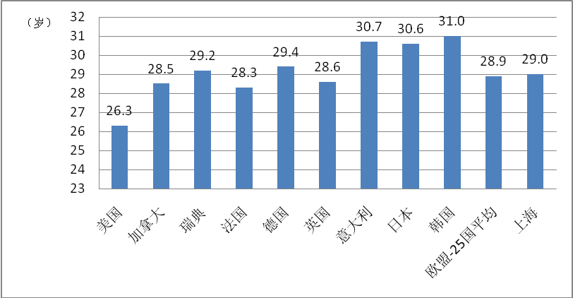 △上海女性初育年龄及国际比较(上海为2015年数据,其他国家数据为2014年)