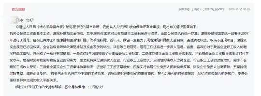 图为云南省人力资源和社会保障厅回复内容 网站截图 摄