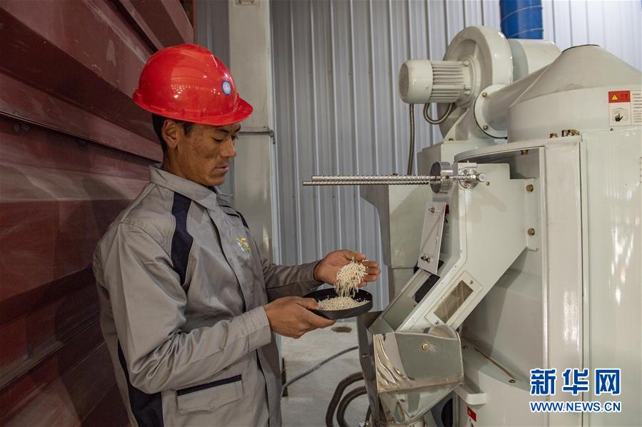 一名员工在青稞精深加工生产线上抽样检测青稞米(11月28日摄)。 11月28日,由德琴3900庄园有限公司建设的青稞精深加工产业园区一期工程在西藏日喀则市桑珠孜区江当乡竣工试运行。青稞精深加工生产线投产,可提升当地的青稞深加工能力,促进农民就业增收。 新华社记者 张汝锋 摄