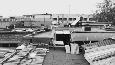 就在这么窄小的胡同房屋一侧,竟然还安装着一个个楼梯,搭在一层住户的房门旁,楼梯宽度不到一米,坡度很陡,要爬上去必须得小心抓稳扶手。记者顺着其中一个楼梯上到二层,二层入口处是一个大平台,平台里面是一排房屋,旁边是一个卫生间。站在平台上能俯视整个平房区,不少楼顶上私搭了二三层的简易房屋。记者发现平房区的北侧和东侧是一栋栋居民楼,南侧是一栋类似厂房的建筑。和四周的高大建筑对比,低矮的平房区漆黑一片,胡同内没路灯,只有从住户窗户透出的微弱灯光,才看出有人居住。